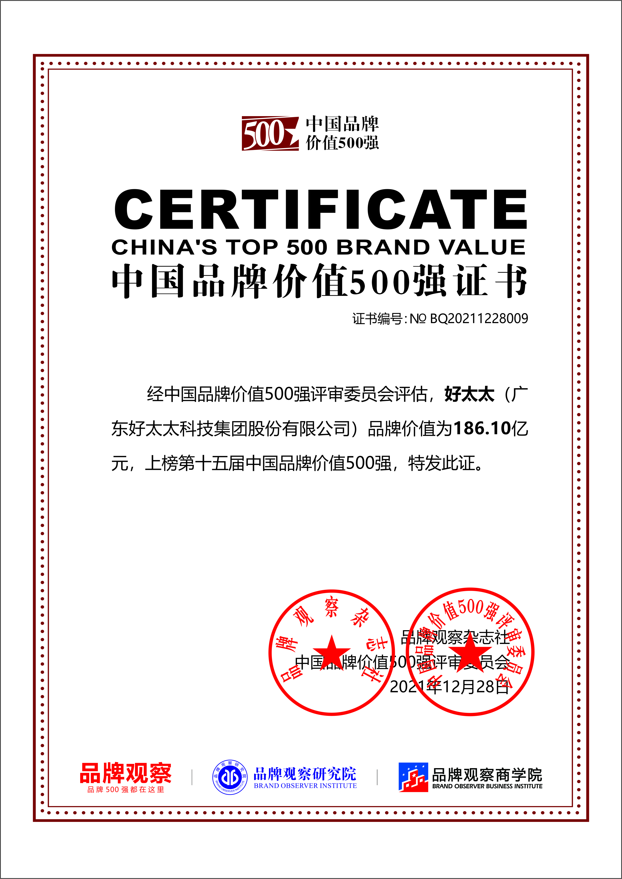 据了解,“中国品牌价值500强”是中国品牌研究领域最具权威性和影响力的奖项之一,第十六届中国品牌价值500强及第九届中国行业标志性品牌评选活动,由品牌观察、品牌观察研究院、品牌观察商学院、中国品牌日报、中国品牌日万里行组委会共同组成的评审委员会完成。